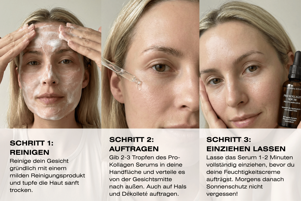 Ab 25 Jahren verliert die Haut etwa 1% ihrer Kollagenproduktion pro Jahr. Das Pro-Kollagen Serum aktiviert durch Signalpeptide die körpereigene Kollagensynthese wieder – für straffere, elastischere Haut, reduzierte Falten und ein jugendlicheres Hautbild. Der Vorteil gegenüber Kollagen-Cremes: Die Wirkstoffe dringen tatsächlich in die Haut ein.