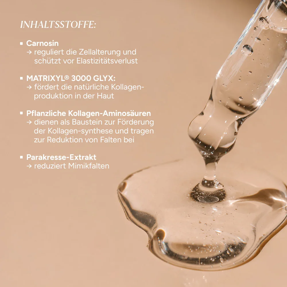 Die Hauptwirkstoffe sind: 3% MATRIXYL® 3000 GLYX (Peptid-Komplex), Carnosin (Antioxidans), pflanzliche Kollagen-Aminosäuren, Parakresse-Extrakt (Mimikfalten-Reduktion) und Hyaluronsäure (Feuchtigkeit). Die vollständige INCI-Liste findest du in den Produktinfos.