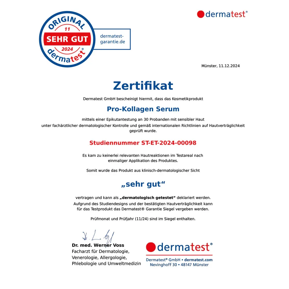 Das Pro-Kollagen Serum wurde dermatologisch mit "Sehr Gut" getestet und ist sehr gut verträglich. In sehr seltenen Fällen kann es bei extrem empfindlicher Haut zu leichten, vorübergehenden Rötungen kommen. Die Formel ist frei von reizenden Inhaltsstoffen.